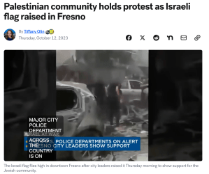 At a Fresno plaza, the flags of Israel and Palestine fly with controversy December 11, 2023February 14, 2025 / Layla Darwish / Leave a comment https://www.kvpr.org/local-news/2023-12-11/at-a-fresno-plaza-the-flags-of-israel-and-palestine-fly-with-controversy
