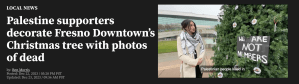 Palestine supporters decorate Fresno Downtown’s Christmas tree with photos of dead December 22, 2023February 14, 2025 / Layla Darwish / Leave a comment https://www.yahoo.com/news/palestine-supporters-decorate-fresno-downtown-012845266.html